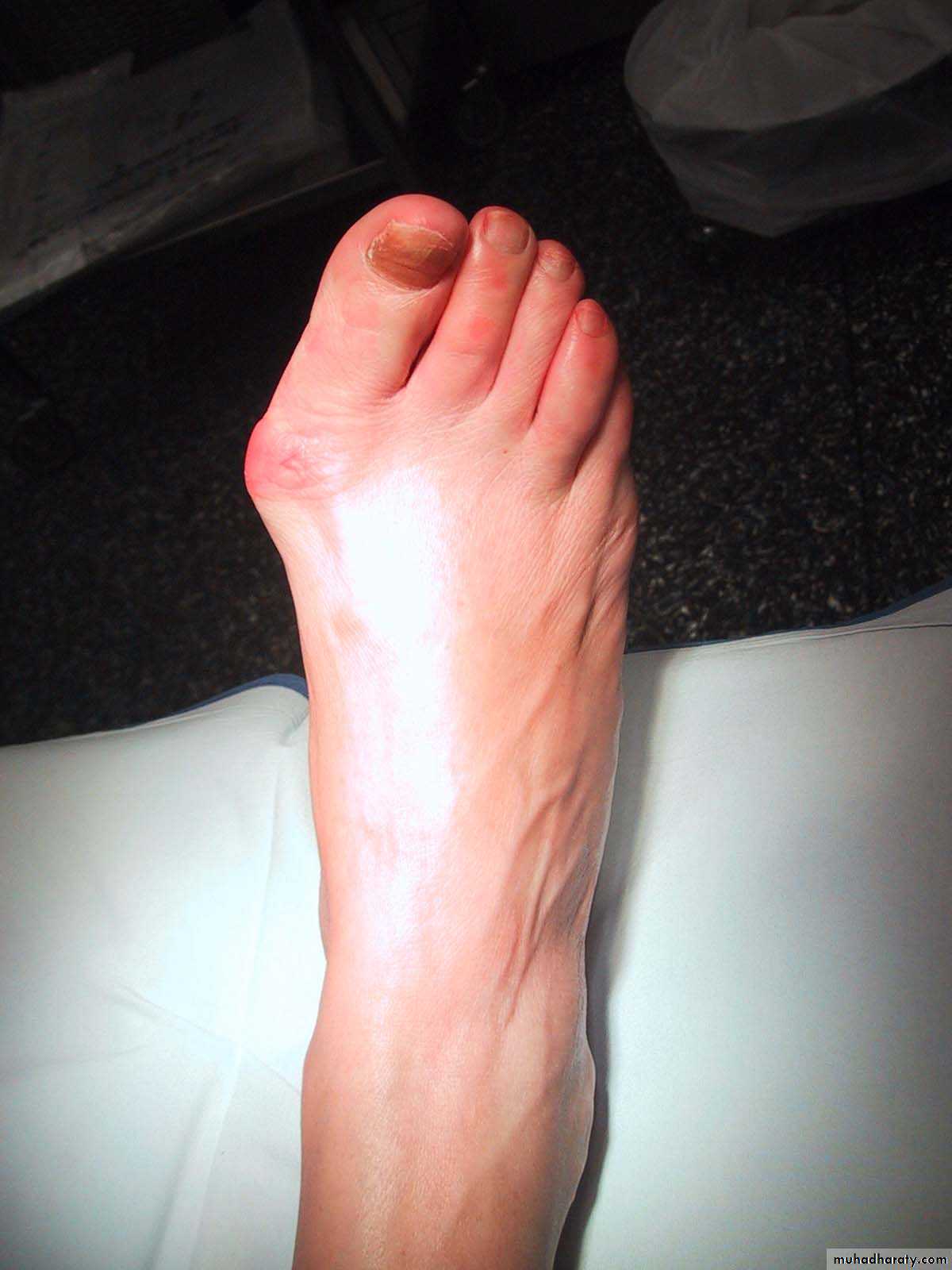 Severe restriction of first MTP joint extension (hallux rigidus), usually due to OA, may cause marked pain