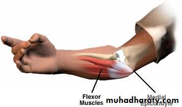 Medial epicondyle pain radiating to flexor forearmTender over medial epicondyle