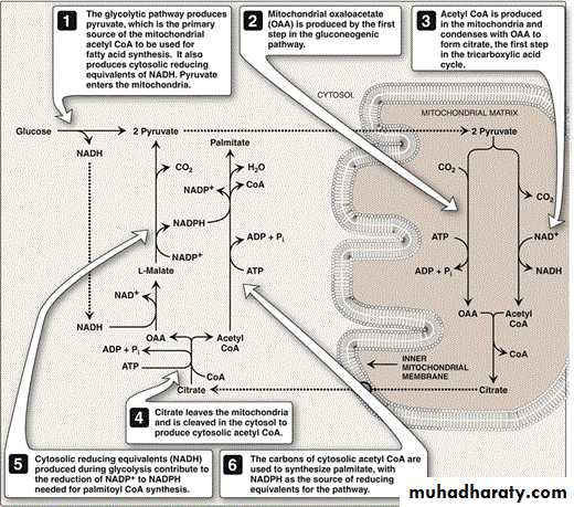 The acetyl Co A will react with oxaloacetate (OA) to form the citrate by the enzyme citrate synthetase. The citrate then will pass the mitochondrial membrane to the cytoplasm where it react with CoA to form acetyl CoA & this step need 1 ATP.