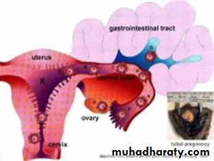 • occurs if implantation is in uterine tube or outside the uterus (external surface of uterus, ovary, gastrointestinal tract, mesentry, peritoneal wall)