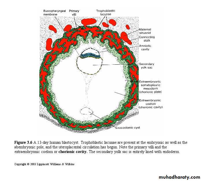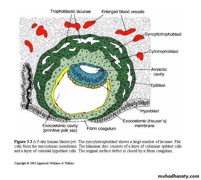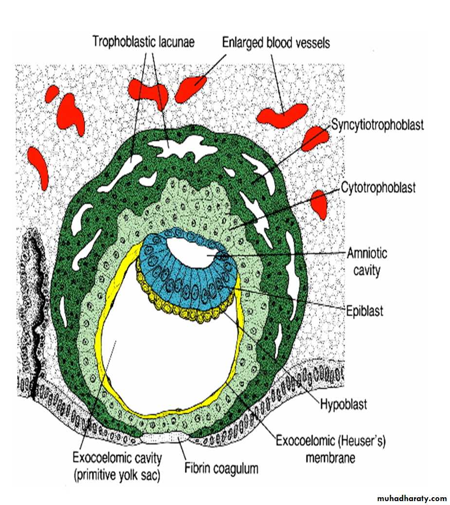 The blastocyst is more deeply embedded in the endometrium, and the penetration defect in the surface epithelium is closed by a fibrin coagulum .The trophoblast shows considerable progress in development, particularly at the embryonic pole, where vacuoles appear in the syncytium. When these vacuoles fuse, they form large lacunae, and this phase of trophoblast development is thus known as the lacunar stage.