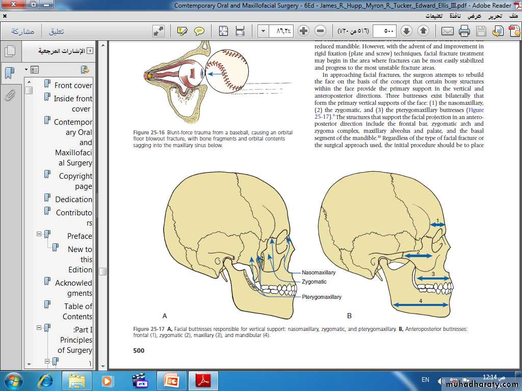 Forces directed onto the midfacial skeleton are absorbed and transmitted through vertical and horizontal buttresses. These buttresses constitute areas of dense, thick bone that support the maxilla and are more resistant to deformation when forces are applied. They are not only important in protecting the vital structures of the midface but they are also essential landmarks used during reconstruction. The buttresses provide higher quality bone for internal fixation and guide reconstruction of facial height, width, and projection.