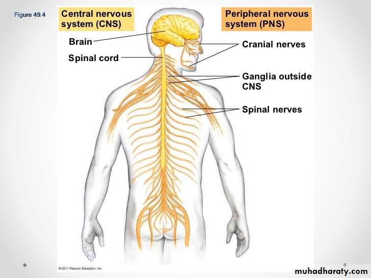 The CNS contains the brain and spinal cord. The PNS consists mainly of nerves, which are enclosed bundles of the long fibers or axons, that connect the CNS to every other part of the body.