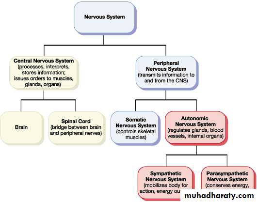 The nervous system is the part of an animal's body that coordinates its actions and transmits signals to and from different parts of its body. In vertebrate species it consists of two main parts, the central nervous system (CNS) and the peripheral nervous system (PNS).