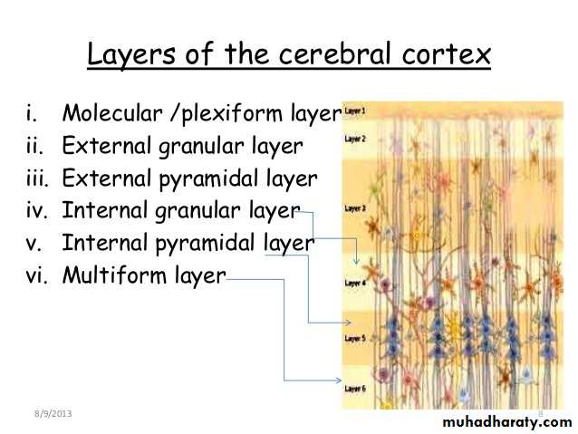 The functional part of the cerebral cortex is a thin layer of neurons covering the surface of all the convolutions of the cerebrum. This layer is only 2 to 5 millimeters thick, with a total area of about one quarter of a square meter. Most of the neurons are of three types: (1) granular (also called stellate), (2) fusiform, and (3) pyramidal, the last named for their characteristic pyramidal shape.The granular neurons generally have short axons and, therefore, function mainly as interneurons that transmit neural signals only short distances within the cortex. Some are excitatory, releasing mainly the excitatory neurotransmitter glutamate, whereas others are inhibitory and release mainly the inhibitory neurotransmitter gamma-aminobutyric acid (GABA).