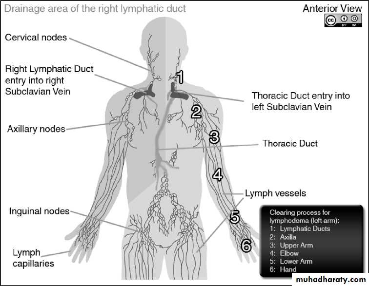 The lymphatic vessels are unidirectional(have valves), conveying fluid (only from tissues)