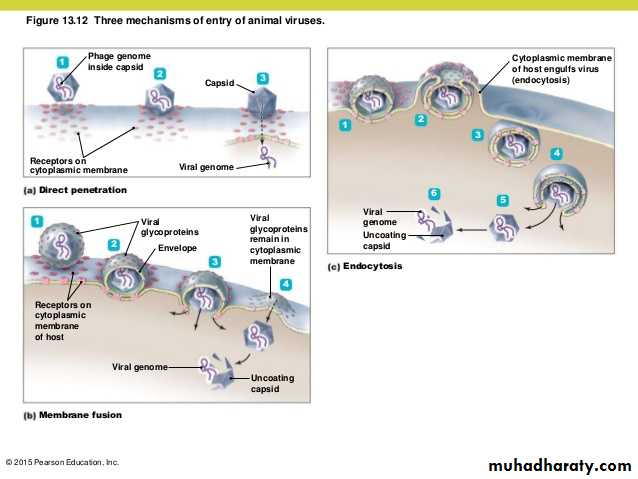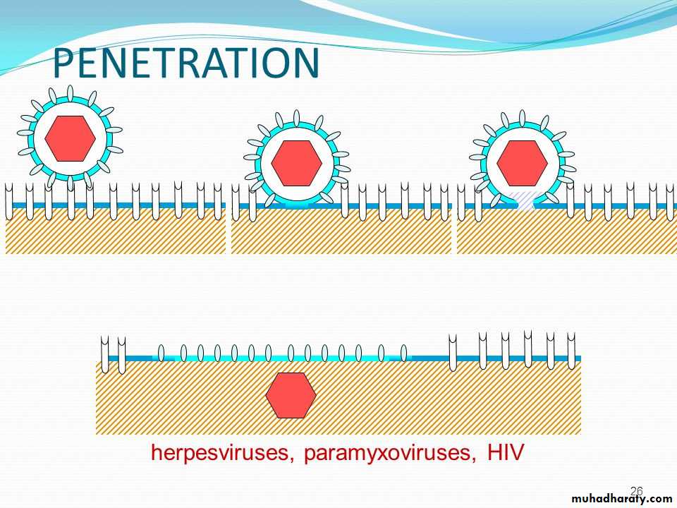 • Depending on their nature, whether enveloped or non-enveloped, the viruses penetrate into cell by different mechanisms: