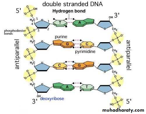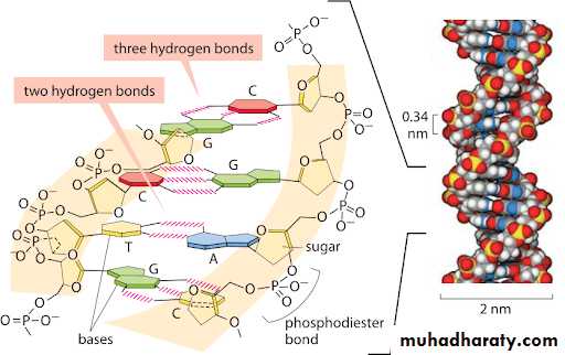 The DNA in a cell usually occurs as a double-stranded, helical structure. The two strands are held together by weak hydrogen bonds between the nitrogenous bases of the opposing strands. The characteristic bonding of A to T and G to C is called base pairing and is fundamental to the remarkable functionality of DNA.