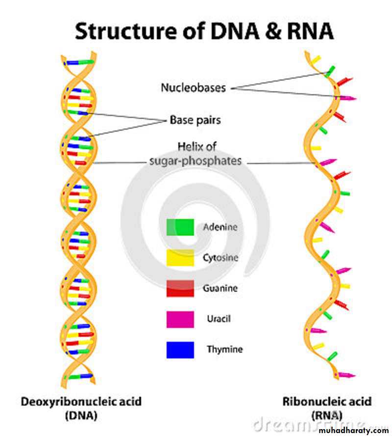 RNA is in many ways similar to DNA, but with some important exceptions. One difference is that RNA is made up of ribonucleotides rather than deoxynucleotides, although in both cases these are usually referred to simply as nucleotides. Another distinction is that RNA contains the nitrogenous base uracil in place of the thymine found in DNA.Like DNA, RNA consists of a sequence of nucleotides, but RNA usually exists as a single-stranded linear molecule that is much shorter than DNA.