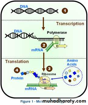 1- RNA polymerase forms a single polyribonucleotide strand, called mRNA, using DNA as a template; this process is called transcription. The template strand in the DNA double helix if read in the 3′–5′ direction. Thus, an mRNA is oriented in a 5′–3′ direction.