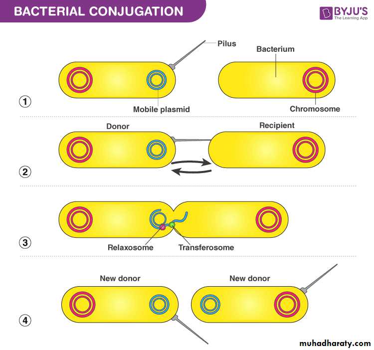 • is a one-way transfer of genetic material (usually plasmids) from donor to recipient by means of physical contact. Conjugation requires donor cell to-recipient cell contact to transfer only one strand of DNA.