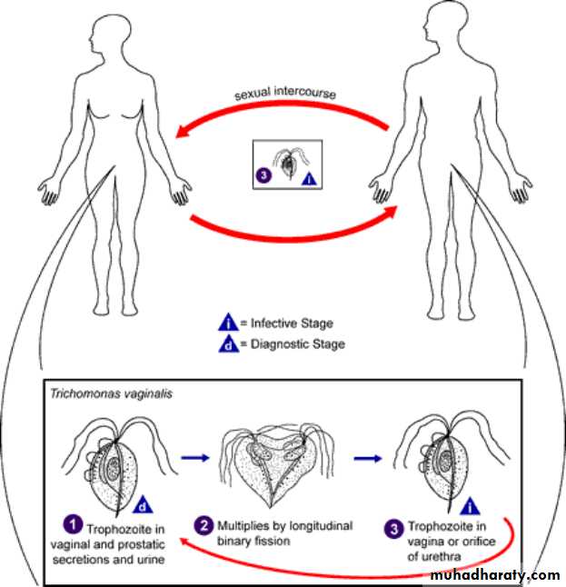 Life cycle of Trichomonas vaginalis is simple. It is completed in a single host either male or female Trichomonas vaginalis resides in the female lower genital tract and the male urethra and prostate, where it replicates by binary fission. The parasite does not appear to have a cyst form, and does not survive well in the external environment. Trichomonas vaginalis is transmitted among humans, its only known host, primarily by sexual intercourse.Transmission of T. vaginalis :