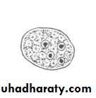 It is found in the lumen of the caecum and lower levels of the large intestine and produced no lesions, but like E. coli its presence indicates that polluted material has been ingested . As the species name nana (dwarf) suggests, this amoeba is small compared with E. histolytica .The trophozoite has endoplasm that is finely granular with numerous minute vacuoles , so that it has a foggy appearance . In contrast, the ectoplasm, with one or more short finger- like pseudopodia when the organism displays activity , is hyaline and almost transparent . The nucleus is ovoidal or sub spherical . There is a relatively large karyosome , consisting of a mass of granules , commonly eccentric in position ,