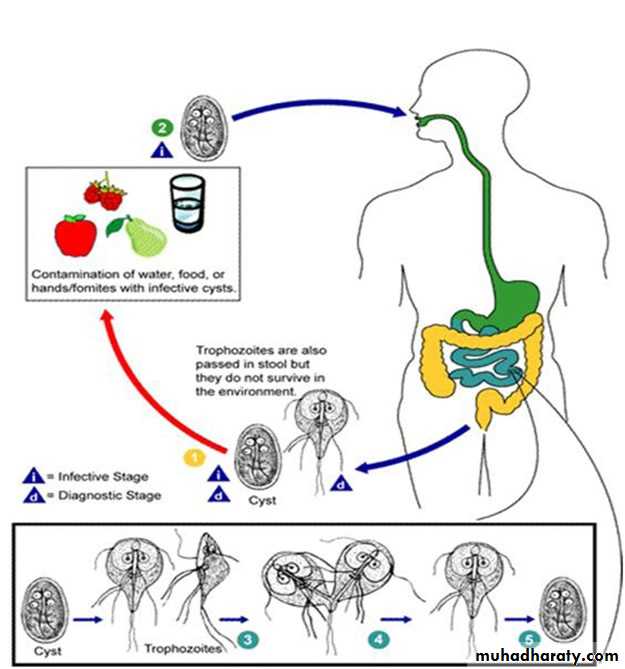 The life cycle of G. lamblia is simple and is completed in a single host, the man .Cysts are resistant forms and are responsible for transmission of giardiasis. The cysts are hardy, can survive several months in cold water. Infection occurs by the ingestion of cysts in contaminated water, food, or by the fecal-oral route (hands or fomites). Cysts pass through the stomach and excyst to trophozoites in the duodenum within 30 minutes of ingestion, Excystation process is trigged by exposure of the cysts to pancreatic enzymes . In duodenum and jejunum, the trophozoite multiply asexually by binary fission thereby producing a large numbers of daughter trophozoites. Trophozoites browse on the mucosal surface, to which they are attached by an oval sucker. When the intestinal contents leave the jejunum and begin to lose moisture, the trophozoites retract their flagella, cover themselves with a thick wall and encyst. These encysted trophozoites undergo another phase of nuclear division and produce four nucleated mature cysts. The four nucleated mature cysts are the infective forms of the parasites, they are excreted in stool and the cycle is repeated. trophozoites may be present in stool of patient with diarrhea but they are not infective.Pathology and symptoms:-