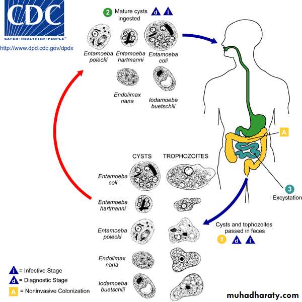 Entamoeba coli:-Is usually the most common amoebic parasitic of man . Although it is a harmless in the lumen of the caecum and lower levels of the large intestine , its presence is concrete evidence that the host has ingested fecal material.