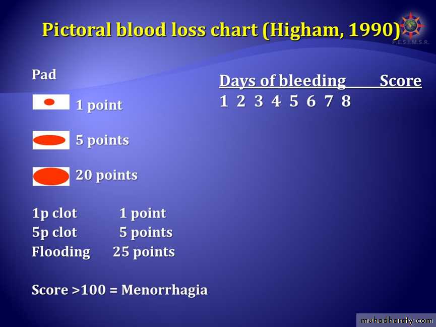 Soaked sanitary pad, presence of clots, blood spills over cloths or bedding, take any time off work due to this bleeding, treatment for anemia or blood transfusion