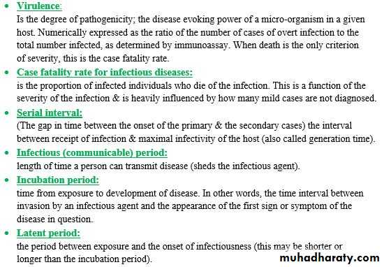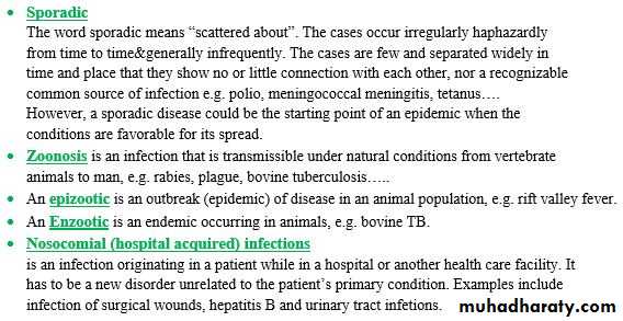 Termination of all transmission of infection by the extermination ابادة of the infectious agent through surveillance and containment. Eradication is an absolute process, an “all or none” phenomenon, restricted to termination of infection from the whole world. The term elimination is sometimes used to describe eradication of a disease from a large geographic region. Disease which are amenable to elimination in the meantime are polio, measles and diphtheria.Surveillance