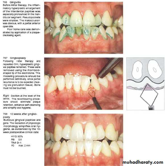 When chronic inflammatory gingival enlargements include a significant fibrotic component that does not undergo shrinkage after scaling and root planning, or if the extent of the gingival enlargement is so severe that access to the deposits on the tooth surface is impossible, surgical removal is the treatment of choice.