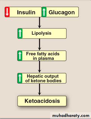 When the rate of ketone bodies production exceed the rate of utilization, there blood level rises this condition called (ketonemia)and eventually when exceed the renal threshold will excreted in urine and this condition called (ketonuria) which often seen in cases of uncontrolled type 1 diabetes.