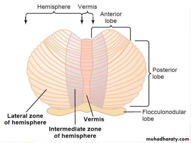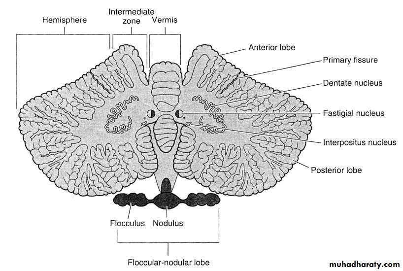 Anatomically, the cerebellum is divided into three lobes by two deep fissures, : (1) the anterior lobe, (2) the posterior lobe, and (3) the flocculonodular lobe been rolled downward from its normally hidden position. Note, down the center of the cerebellum, a narrow band called the vermis, which is separated from the remainder of the cerebellum by shallow grooves. Most cerebellar control functions for muscle movements of the axial body, neck, shoulders, and hips are located in this area.The cerebellar deep nuclei (or cerebellar nuclei) are the sole output structures of the cerebellum. These nuclei are encased by a highly convoluted sheet of tissue called the cerebellar cortex, which contains almost all of the neurons in the cerebellum..