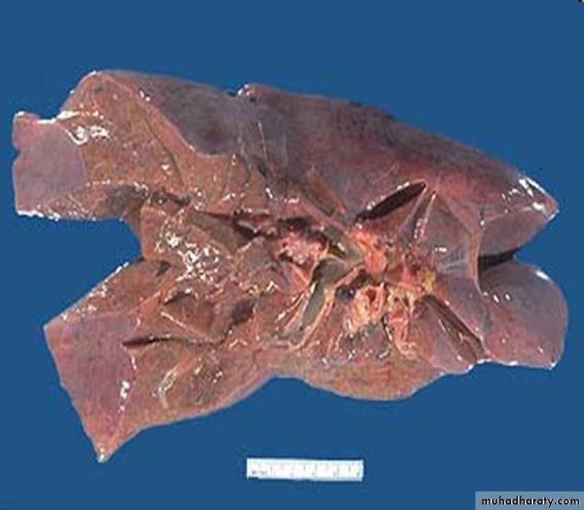 Gross examination the central regions of the hepatic lobules, viewed, are red-brown and slightly depressed (owing to cell loss) and are accentuated against the surrounding zones of uncongested tan, sometimes fatty, liver (nutmeg liver)