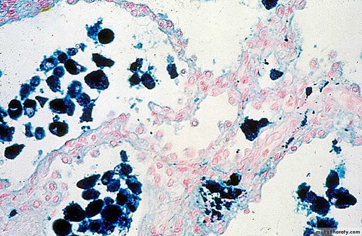 Fig:Special stain for haemosiderin (prusian blue) for heart failure cells
