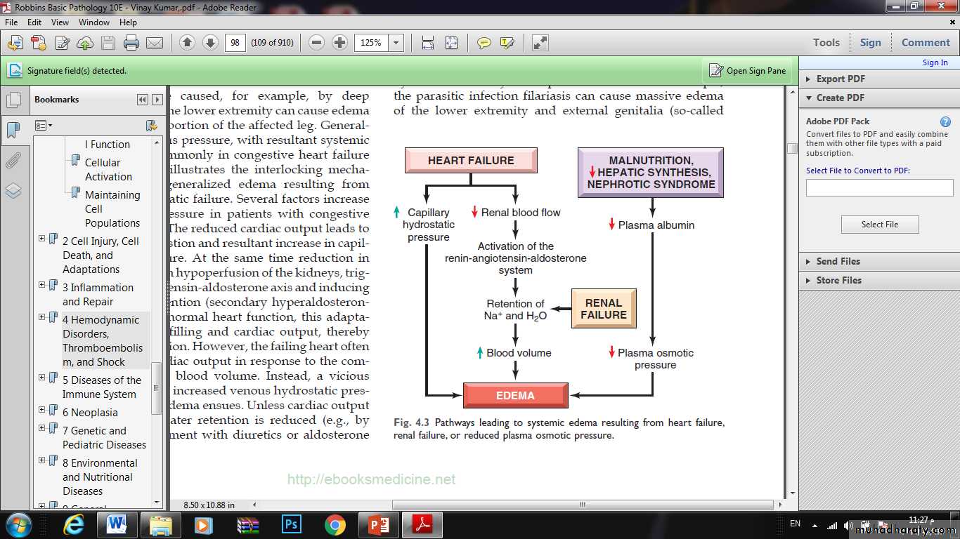 reduction in cardiac output results in hypoperfusion of the kidneys, triggering the renin-angiotensin-aldosterone axis and inducing sodium and water retention (secondary hyperaldosteronism) leads to increase blood volume and worsening of edema .