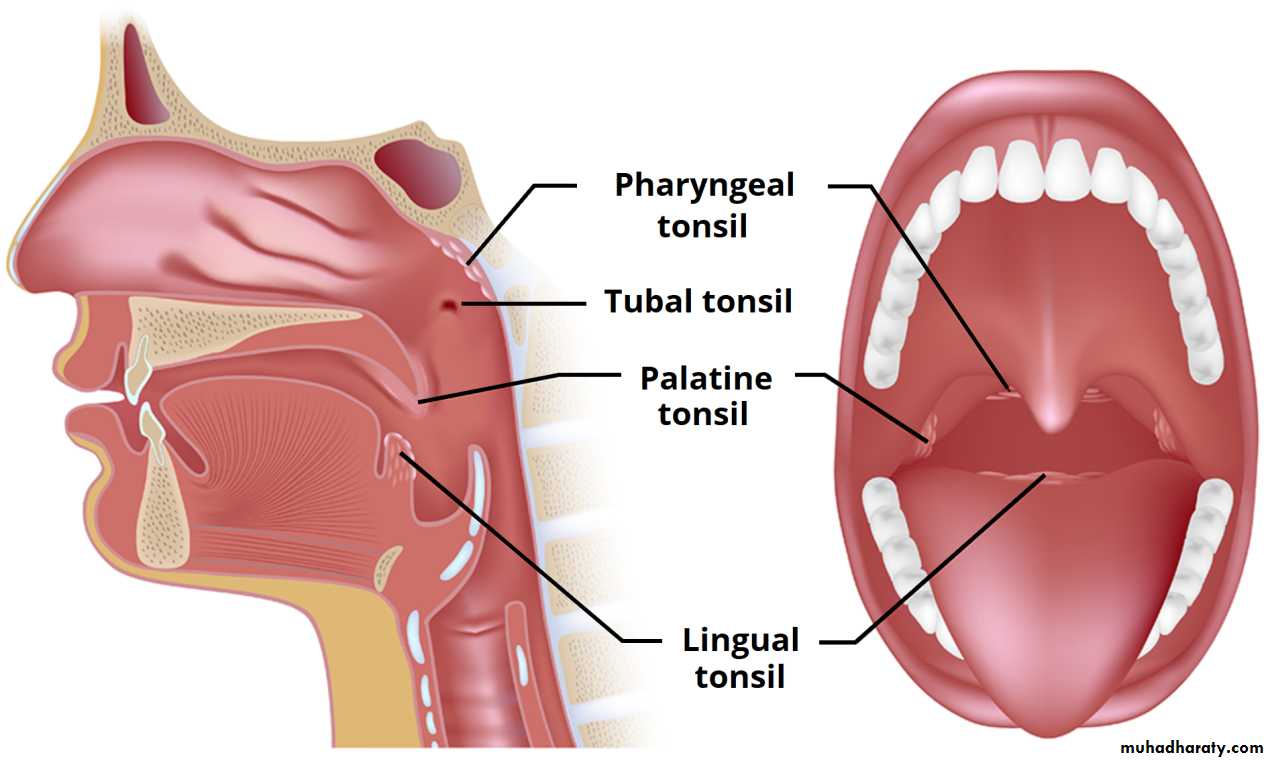 It lies behind the nasal cavity (nasopharynx), oral cavity (oropharynx) and larynx (laryngopharynx) Pharynx is composed of the following four coats: 1. Mucosa: This comprises epithelium and lamina propria. The epithelium is pseudo stratified ciliated columnar type in the nasopharynx and stratified squamous type in the oropharynx and laryngopharynx. Aggregation of lymphatic nodules in the lamina propria of the posterior wall and around the opening of the auditory tube in the nasopharynx results in the formation of pharyngeal and tubal tonsils, respectively. The palatine tonsil present in the lateral wall of the oropharynx and the lingual tonsil in the pharyngeal part of tongue, are already dealt with under lymphatic system.2. Submucosa: It is formed by loose areolar connective tissue .