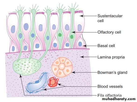 olfactory mucosa is made of a thick olfactory epithelium and the underlying connective tissue, the lamina propria, The lamina propria contains serous glands (Bowman’s glands), bundles of olfactory nerves, blood vessels and lymphatics. The secretion of Bowman’s glands moistens the olfactory epithelium and serves as a solvent which dissolves odoriferous substances and thus stimulates the olfactory cells.