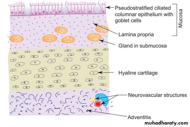 GENERAL STRUCTURE OF THE CONDUCTING PORTION OF THE RESPIRATORY TRACT : In general, the respiratory tract is made of four coats : 1. Mucosa: It includes the epithelial lining and the underlying lamina propria. The epithelium is usually pseudostratifi ed ciliated columnar epithelium with goblet cells. 2. Submucosa: It is a layer of loose connective tissue containing mixed glands. 3. Cartilage layer: This layer is mostly formed by hyaline cartilage plus smooth muscle. 4. Adventitia: It is a layer of fibroelastic connective tissue merging with the surrounding tissue.