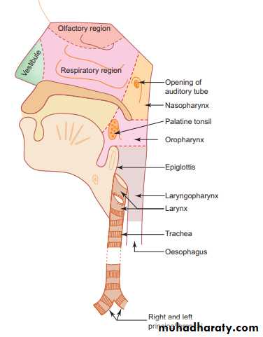 The respiratory system is functionally divided into two portions: 1- the conducting portion . 2- and the respiratory portion . The conducting portion provides passage of air as well as conditions the inspired air, it is includes the upper respiratory tract :1-nasal cavity . 2- pharynx . 3- larynx . 4- and parts of lower respiratory tract (trachea, bronchi and bronchioles).