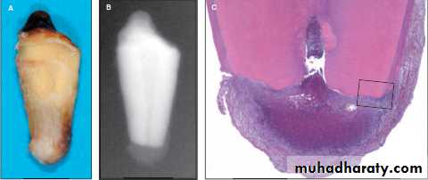 Depending on the amount of calcified tissue lost, root resorption can be detected by periapical radiographs. However, in many cases, the condition can be disclosed only by histologic sections Osteoclasts and odontoclasts possess similar enzymatic properties and resorb their target tissues in a similar manner.
