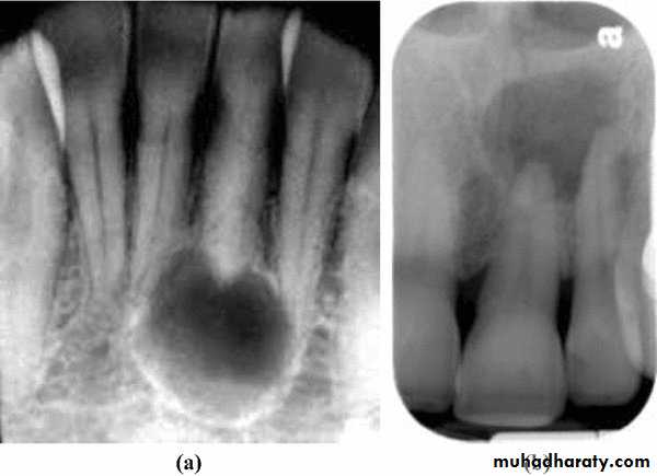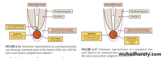 .” Periapical pocket cysts and periapical true cysts cannot be differentiated clinically or radiographically from other periapical conditions that manifest as radiolucencies. In the past, many practitioners have erroneously thought that well-defined borders of the radiolucency indicated a cyst but this is only indicative of a slowly developing lesion. A diffuse border is more likely to indicate a rapidly developing lesion. Likewise, the size of the radiolucency is not indicative of a cyst if it is large—since apical periodontitis, abscesses and cysts can be small or large. A large radiolucency is more likely to indicate a long-standing problem. Periapical pocket cysts cannot be diagnosed clinically and can only be diagnosed histologically. However, clinicians should recognize that this condition does occur and it should be part of the differential diagnosis of a persistent radiolucency following endodontic treatment