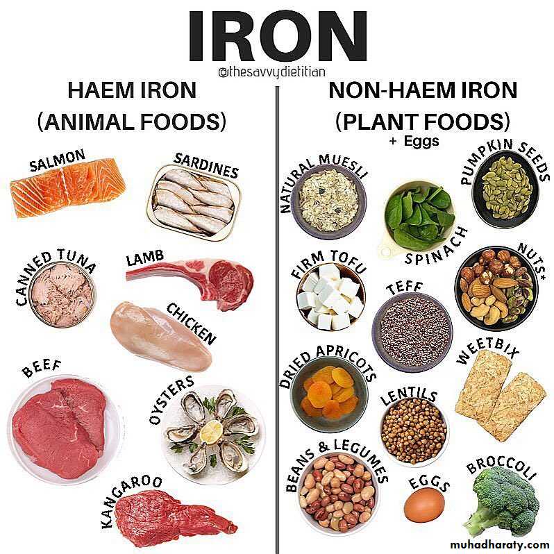 • Non-haem iron in cereals and vegetables is poorly absorbed but makes the greater contribution to overall intake, compared to the well-absorbed haem iron from animal products.