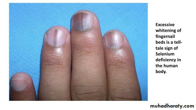 • Selenium deficiency can cause hypothyroidism, cardiomyopathy in children (Keshan’s disease) and myopathy in adults.