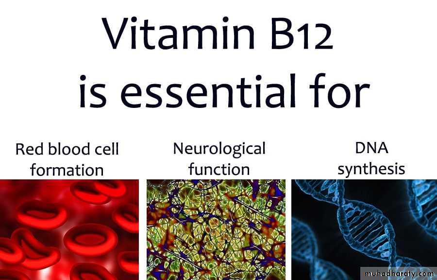 Vitamin B12 is a co-factor in folate co-enzyme recycling and nerve myelination. Vitamin B12 and folate are particularly important in DNA synthesis in red blood cells.MEGALOBLASTIC ANEMIA