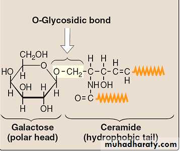 A. Neutral glycosphingolipids:-The simplest neutral (uncharged) glycosphingolipids are the cerebrosides. These are ceramidemonosaccharides that contain either a molecule of galactose (galactocerebroside—the most common cerebroside found in membranes) or glucose (glucocerebroside, which serves primarily as an intermediate in the synthesis and degradation of the more complex glycosphingolipids).Cerebrosides are found predominantly in the brain and peripheral nervous tissue, with high concentrations in the myelin sheath.