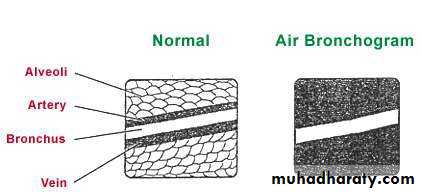 • Air bronchogram (air-filled bronchi appear lucent against