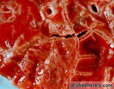 • Presence of a proteinaceous exudate—and often of bacteria—in the alveoli• RED HEPATIZATION