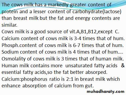from cows,sheep,goat are unsuitable for feeding infants They are nonhygenic,generate high solute load,have inappropriate Ca:Ph ratio & low in iron and vitamins B12