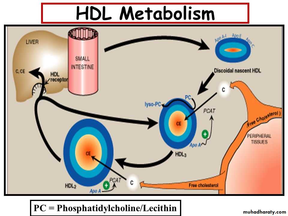 N.B PC = phosphatidylcholine; lyso-PC = lysophosphatidylcholine. PCAT = Phosphatidylcholine cholesterol transferase. CETP = cholesteryl ester transfer protein. ABCA1 = transport protein. [Note: For convenience the size of VLDLs are shown smaller than HDL, whereas VLDLs are larger than HDL.]