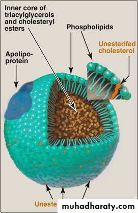 Lipoproteins are composed of a neutral lipid core (containing triacylglycerol, and cholesteryl esters) surrounded by a shell of amphipathic apolipoproteins, phospholipid, and nonesterified cholesterol. These amphipathic compounds are oriented so that their polar portions are exposed on the surface of the lipoprotein, thus making the particle soluble in aqueous solution.Structure of a typical lipoprotein particle