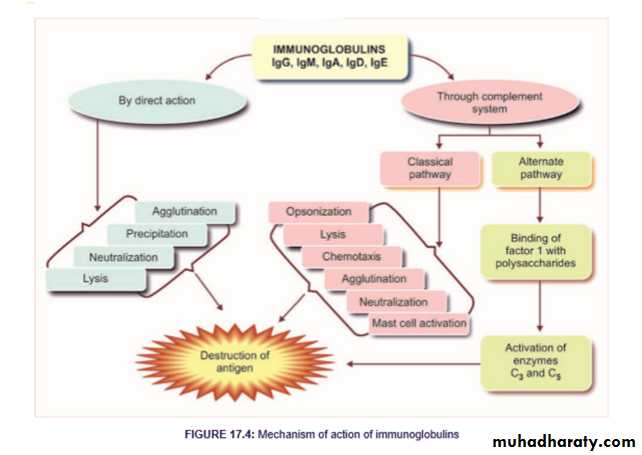 Antibodies act mainly in two ways to protect the body against invading agents: (1) by direct attack on the invader and (2) by activation of the “complement system” that then has multiple means of its own for destroying the invader.Because of the bivalent nature of the antibodies and the multiple antigen sites on most invading agents, the antibodies can inactivate the invading agent in one of several ways, as follows: