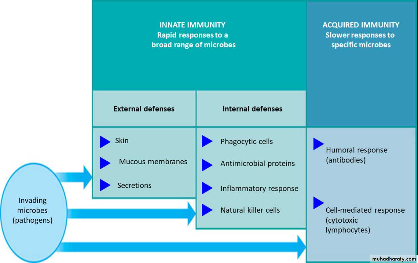 Immunity is body's ability to resist or eliminate potentially harmful foreign materials or abnormal cells like bacteria, virus, toxic substances. Immunity is of two types:I. Innate immunity.