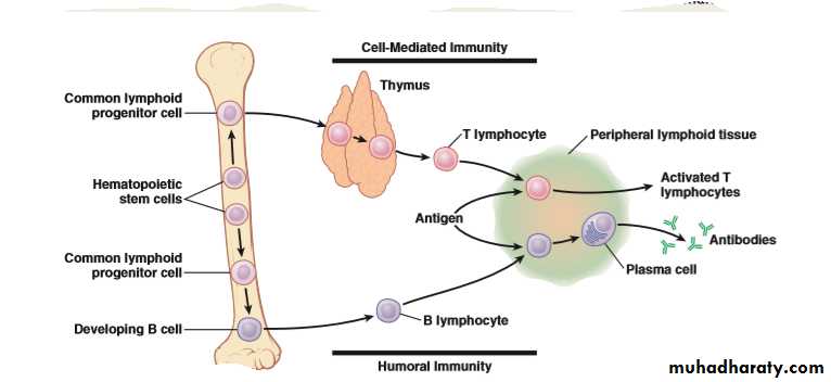 During fetal development, lymphocyte precursors come from the bone marrow. Those that populate the thymus become transformed by the environment in this organ into the lymphocytes responsible for cellular immunity (T lymphocytes).humoral immunity (B lymphocytes the transformation to B lymphocytes occurs in bursal equivalents, ie, the fetal liver and, after birth, the bone marrow. After residence in the thymus or liver, many of the T and B lymphocytes migrate to the lymph nodes and bone marrow. Most of the processing occurs during fetal and neonatal life. However, there is also a slow, continuous production of new lymphocytes from stem cells in adults.