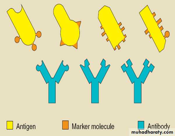 • Agglutination, in which multiple large particles with antigens on their surfaces, such as bacteria or red cells, are bound together into a clump