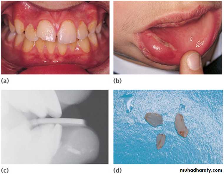 COLLEGE OF DENTISTRYCrown fracture with associated swollen lip and evidence of a penetrating wound suggests retention of tooth fragments within the lip.:
