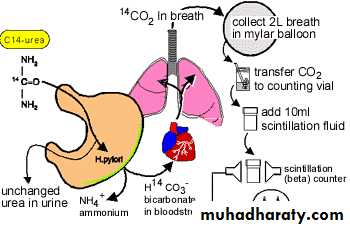 Urea breath test: - high sensitivity and specificity by using C14 (with high radioactivity and C13 (expensive method).