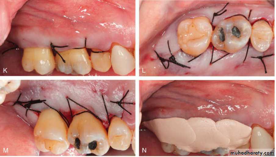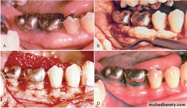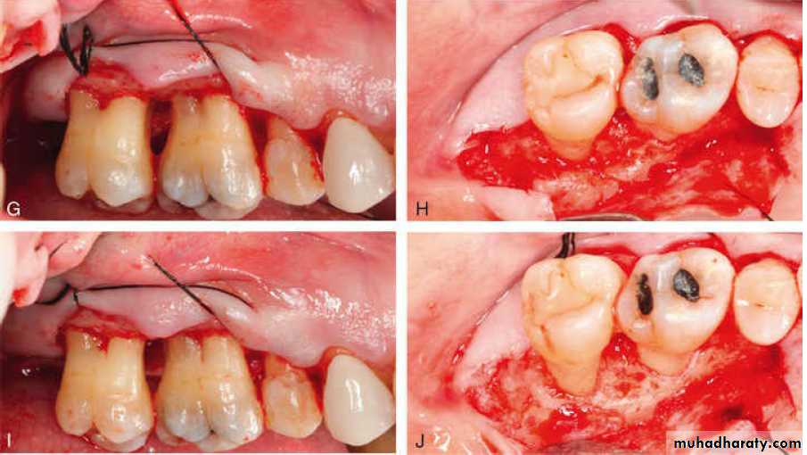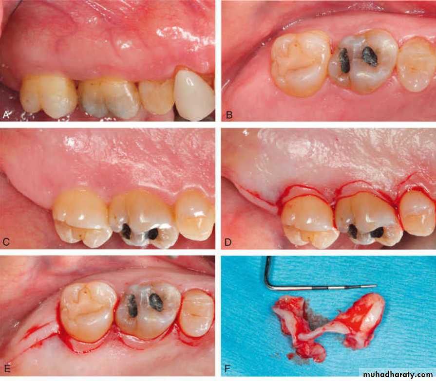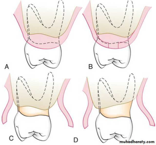 The two incisions distal to the molar should follow the area with the greatest amount of attached gingiva. Therefore the incisions could be directed distolingually or distobuccally, depending on which area has more attached gingiva. Before the flap is completely reflected, it is thinned with a #15 blade. After the reflection of the flap and the removal of the redundant fibrous tissue, any necessary osseous surgery is performed