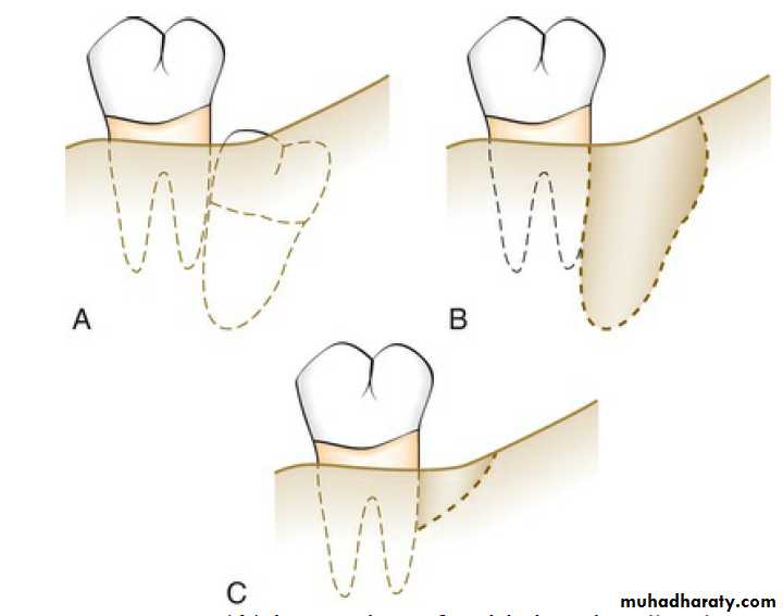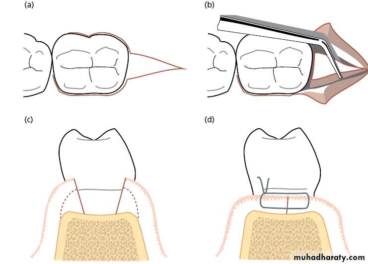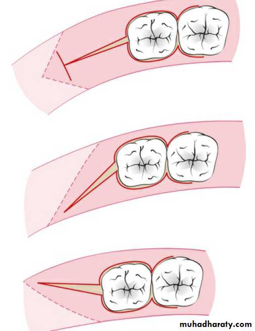 the incisions could be directed distally or distobuccally, depending on which area has more attached gingiva. Incisions directing distolingually should be avoided due to the potential presence of the lingual nerve.